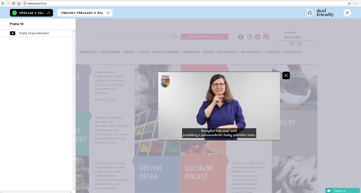 Městská část Praha 10 se rozhodla jako jeden z prvních úřadů v České republice zpřístupnit informace týkající se každodenních situací pro neslyšící. Část webových stránek www.praha10.cz tedy nově najdete i v českém znakovém jazyce. Na webových stránkách Městské části Praha 10 od ledna neslyšící naleznou informace například o tom, jak vyřídit nové doklady nebo zažádat o obecní byt také v českém znakovém jazyce. Do toho přeložila také část sociálního portálu, který provozuje, a kde řeší témata jako násilí, problémy s se starými nemocnými rodiči nebo problémy s dětmi.