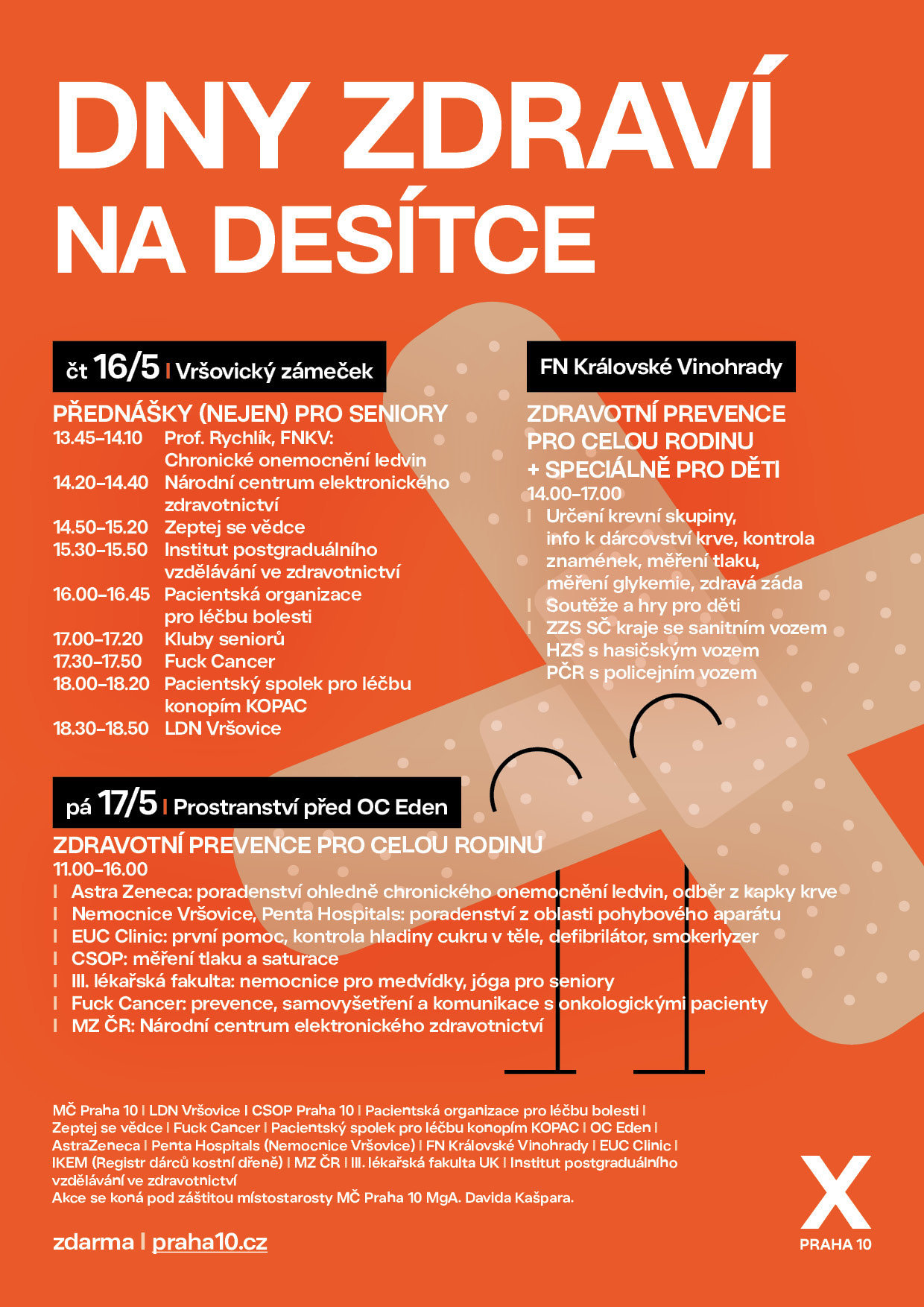 Na třech místech proběhne ve dnech 16. a 17. května první ročník preventivně osvětové akce Dny zdraví na Desítce. Akce odstartuje ve čtvrtek ve 14 hodin v areálu FN Královské Vinohrady, kde je připravený i speciální program pro děti, souběžně budou celé odpoledne probíhat přednášky (nejenom) pro seniory ve Vršovickém zámečku. Pátek bude ve znamení testování, poradenství, edukace a osvěty ve stánkové zóně před OC Eden. Akce probíhá pod záštitou místostarosty MČ Prahy 10 MgA. Davida Kašpara, do programu se zapojilo celkem šestnáct subjektů a partnerů působících v oblasti zdravotnictví, sociálních služeb a vzdělávání na území městské části.